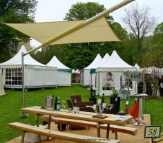 System mit 4 Masten/ Wind- & Sonnenwächter/ Fernbedienung/ Höheneinstellung. Ausgestattet mit einem wasserabweisendem Tuch, aus einem acrylatbeschichtetem Polyestergewebe (seit 2011 nicht mehr im Angebot).