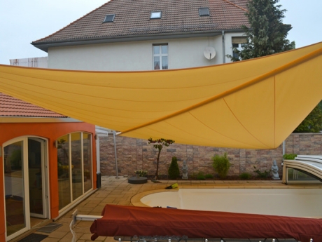 System (2M/2W) mit 3 Masten/ 1 Wandbefestigung & ein Pylon an Wandhalterung/ Höheneinstellung/ Wind- & Sonnenwächter/ Fernbedienung. Sonderzubehör: Wandbefestigung für Pylone und Masten. Ausgestattet mit dem selbstreinigendem Nano Tuch - regendicht, lichtdurchlässig und mit höchstem UV-Schutz, sternförmig geschnitten, mit 2 Schotblechen.